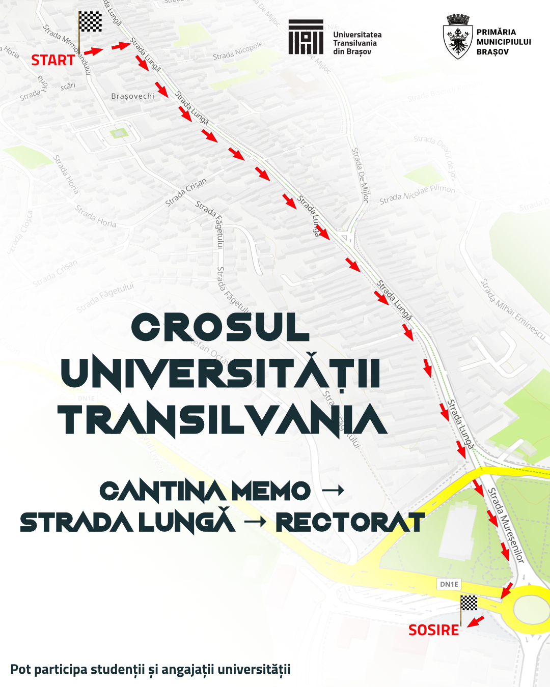 Universitatea Transilvania din Brașov invită studenții și angajații să participe la Crosul Universității Transilvania, un eveniment sportiv dedicat mișcării, spiritului competițional și comunității academice.